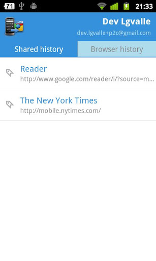 Phone 2 Google Chrome™ browser -> parecido a chrome to phone pero al revez. Si quieres enviar un link al navegador de tu computadora atraves de tu celular solo tienes que precionar menu y compartir o dejar apretado el enlace que quieres hasta que te salga la opcion de enviarlo.