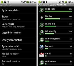 Primero tenemos que saber que aplicaciones están usando batería, para ver esto tienen que ir a Menú-> Ajustes->Acerca del Teléfono->Uso de la batería. En inglés es (Menu->Setting->About Phone->Battery Use) Aquí se ve el porciento de batería y las aplicaciones que la están consumiendo.